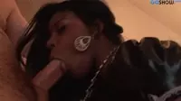 In a dimly lit room, an ebony couple passionately indulge in their mutual desires.The woman's skin glows under the warm, flickering glow of candlelight, her caramel complexion accentuating the sensual allure of her curves.The man's muscular build and chiseled features are a testament to his prowess and passion for fulfilling her every carnal whim.As their lips intertwine, their hands explore each other's body with an intensity that only love can inspire.Her fingers gracefully slide down his defined abs, tracing intricate patterns as they lead the way to the prize - a thick, ebony rod standing proudly at attention, aching for her touch.His hand finds her waist, gripping it with a tenderness that belies the heat that now courses through their veins, the passion and need burning brighter than the flames before them.As the kiss deepens, he pulls away long enough to trail his tongue along her smooth neck, teasingly close to the pulsating spot where their heartbeats synchronize in a primal dance.His mouth then makes its way down to her sensitive ear, nibbling and whispering filthy promises that send shivers racing up her spine.The anticipation has built to a fever pitch as she sinks to her knees before him, eagerly taking him into her waiting throat.With an iron grip in her hand and the other massaging his balls, she goes down on him with skill and determination, using every trick she's learned from their years together, each stroke bringing them closer to the brink of ecstasy.She feels the man's body stiffen and convulse as he fights to maintain control over the ravenous beast within him, a bead of pre-cum already forming on the tip of his dick.She pulls away momentarily, her eyes never leaving his as she swirls her tongue around his throbbing head, savoring the salty taste that fills her senses.He moans and writhes beneath her, a picture of pure want and desire.She gazes up at him, knowing she holds all the power in this moment, and slides him back inside her mouth.The man can no longer contain himself, his breath ragged as he begins to unload his sticky seed onto the woman's eager tongue and throat.As the last spasms subside and they bask in the afterglow of their blissful release, their gazes lock once more, a silent promise spoken between them - to forever explore the depths of their passions and unending love for one another, no matter where this insatiable hunger may take them.